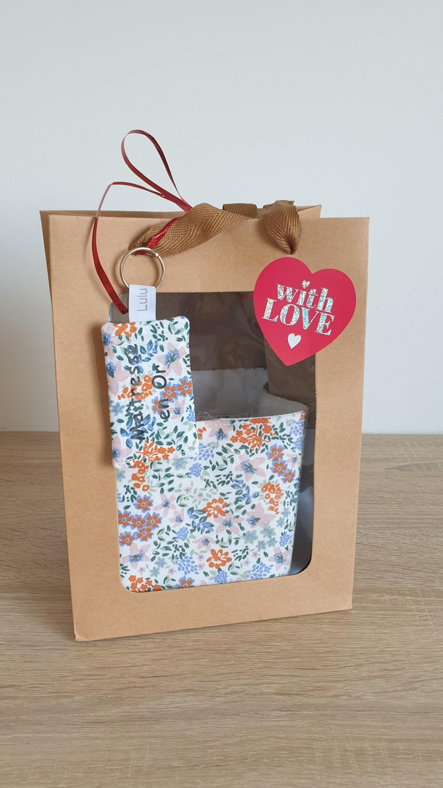 Coffret: panier +7 cotons + porte clés Maîtresse en Or (fleuri orange)
