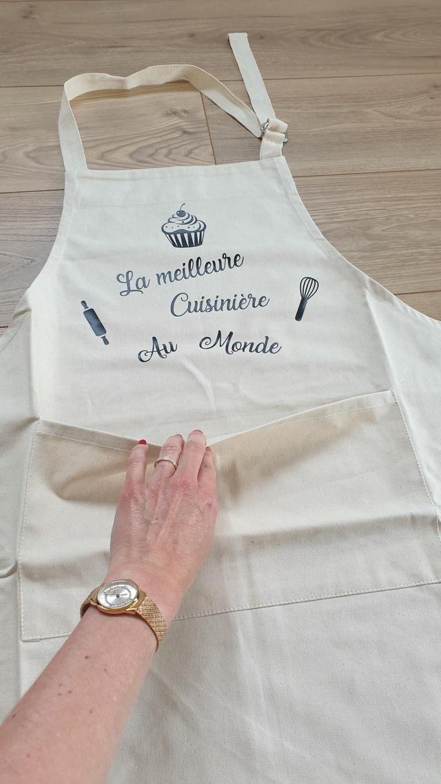 Tablier de cuisine réglable au niveau du cou, grande anses pour pouvoir avoir le choix de fermer le tablier sur le devant ou derrière